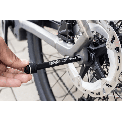 Le Thru Axle M6-Connector est un axe adaptateur universel conçu pour fixer en toute sécurité porte-bagages. Fabriqué en aluminium haute qualité, il allie robustesse et polyvalence grâce à ses filetages M6 intégrés.Compatible avec des axes jusqu’à 180 mm, il s’adapte facilement aux longueurs de 165 mm (conique) et de 168 mm à 180 mm grâce aux entretoises fournies. Pour des axes plus courts, l’installation reste possible si l’axe peut être vissé à travers le cadre.Disponible en trois pas de vis et compatible avec SRAM UDH/Transmission, cet axe est la solution idéale pour les montages exigeants.